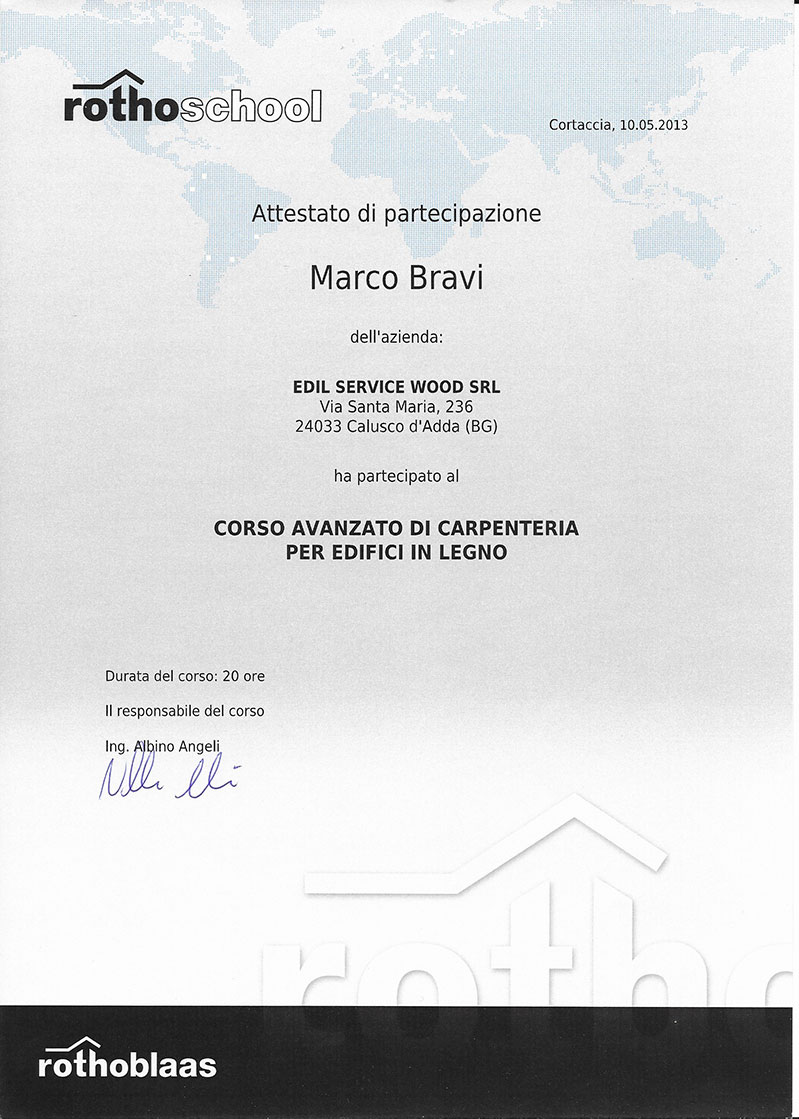 Le operazioni di posa in opera vengono effettuate esclusivamente da personale interno, altamente specializzato e qualificato grazie a un'esperienza acquisita da più di vent'anni di attività nel settore delle strutture in legno. Non si ricorre pertanto ad alcun tipo di subappalto; ció costituisce per il cliente, che si ritrova quindi un unico referente in fase di posa in opera, una garanzia di serietá e professionalitá che si tramutano inevitabilmente in qualitá del prodotto finale. Grande importanza viene affidata alla formazione delle maestranze, che partecipano periodicamente a corsi professionali specifici inerenti le tematiche relative al montaggio e agli aspetti di fisica tecnica legati agli edifici con struttura in legno. L'esperienza maturata dalle maestranze consente infine di ottimizzare gli aspetti cantieristici, con pulizia e ordine dello stesso, elevata organizzazione logistica, rapiditá di esecuzione e controllo rigoroso degli aspetti legati alla sicurezza.